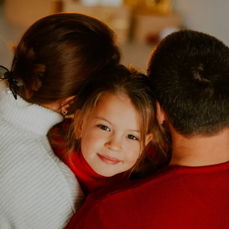 une petite fille enlacée par ses parents